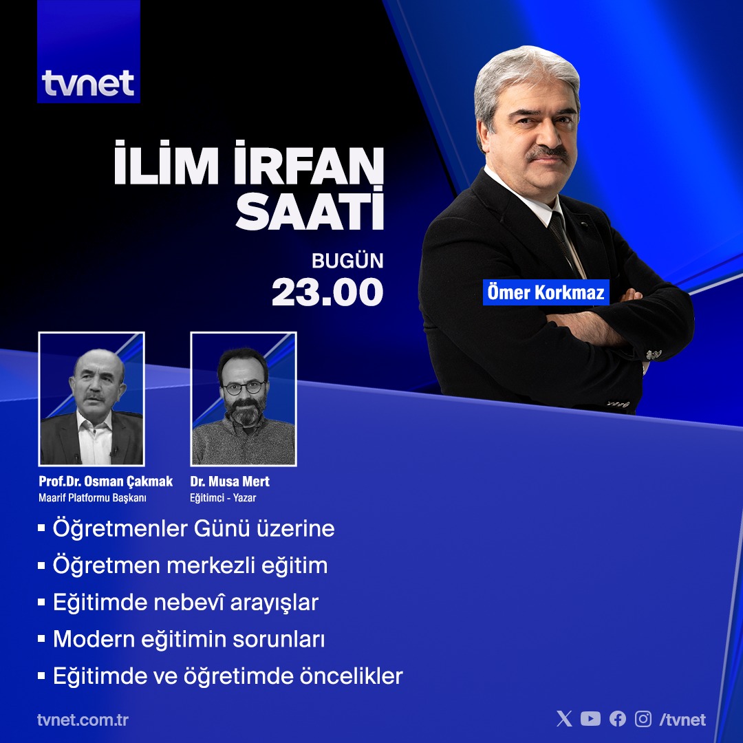 Eğitimde Nebevi Arayışlar - TVNET - Canlı Yayın 24 Kasım 2023 Cuma günü saat 23.00'da TVNET'te İlim İrfan Saati programında Ömer Korkmaz Bey'in canlı yayın konuğu olacağım. 24-Kas-2023 23.00 https://www.tvnet.com.tr/canli-yayin 226