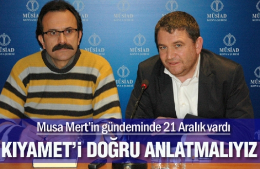 MÜSİAD Konya Şubesi Cuma Toplantılarına ilahiyatçı Musa Mert konuk oldu. İlmihal sohbetinin yapıldığı Cuma toplantısında Mert, son dönemde Maya takvimi ile başlayan tartışmaların Müslümanlar açısından durumunun çok farklı olduğunu söyledi.