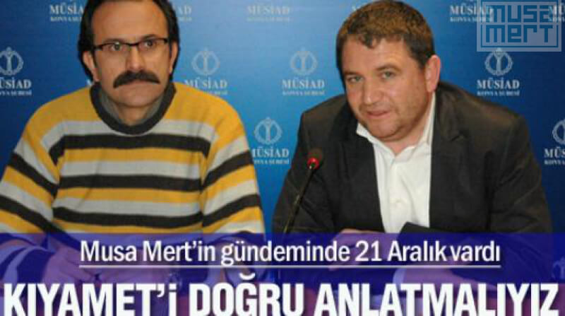 Müslüman camia için Maya Takviminin alay konusu olduğunu söyleyen Musa Mert, “Maya takvimini görmezden gelemiyorsun, olmamış gibi davransak insanların gündemine kıyamet girdi. O yüzden insanlara kıyameti doğru şekilde anlatmamız lazım" dedi.