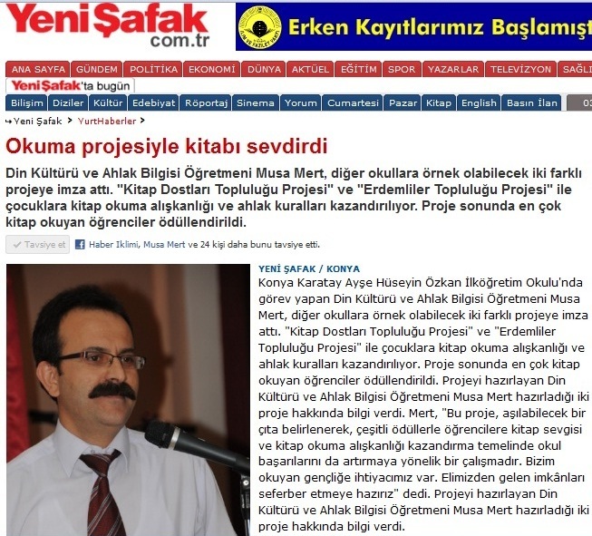 Konya Karatay Ayşe Hüseyin Özkan İlköğretim Okulu'nda görev yapan Din Kültürü ve Ahlak Bilgisi Öğretmeni Musa Mert, diğer okullara örnek olabilecek iki farklı projeye imza attı. "Kitap Dostları Topluluğu Projesi" ve "Erdemliler Topluluğu Projesi" ile çocuklara kitap okuma alışkanlığı ve ahlak kuralları kazandırılıyor. Proje sonunda en çok kitap okuyan öğrenciler ödüllendirildi. Projeyi hazırlayan Din Kültürü ve Ahlak Bilgisi Öğretmeni Musa Mert hazırladığı iki proje hakkında bilgi verdi. Mert, "Bu proje, aşılabilecek bir çıta belirlenerek, çeşitli ödüllerle öğrencilere kitap sevgisi ve kitap okuma alışkanlığı kazandırma temelinde okul başarılarını da artırmaya yönelik bir çalışmadır. Bizim okuyan gençliğe ihtiyacımız var. Elimizden gelen imkânları seferber etmeye hazırız" dedi. Projeyi hazırlayan Din Kültürü ve Ahlak Bilgisi Öğretmeni Musa Mert hazırladığı iki proje hakkında bilgi verdi.